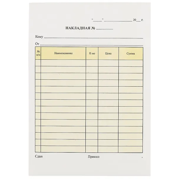 Бланк двухслойный самокопирующийся "Накладная". Бланк изготовлен из самокопирующейся бумаги. На верхний лист текст наносится обыкновенной ручкой, карандашом или матричным принтером. Оттиск черного цвета появляется одномоментно на нижележащем листе. Бланки изготовлены из офсетной бумаги. В склейке 50 экземпляров. Упаковка в термоусадочную пленку.