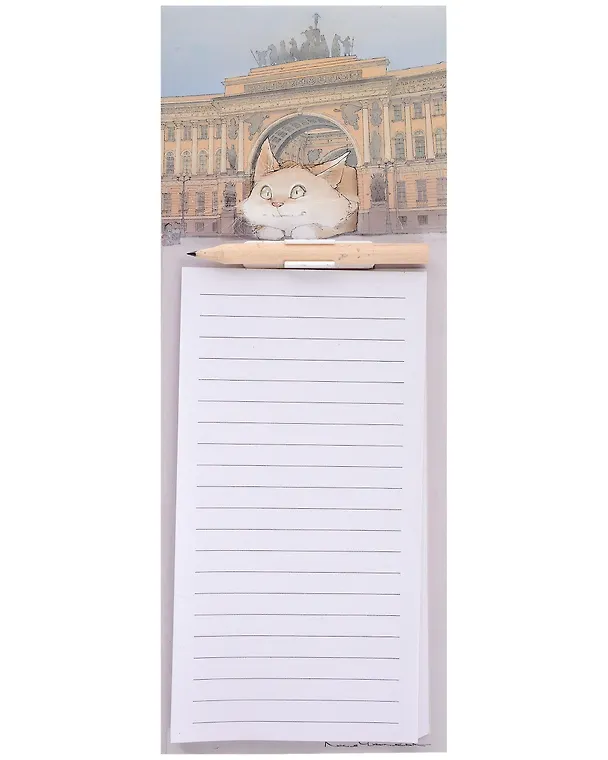 Должна сказать, что не знала о таком виде блока записных листочков, но с удовольствием взяла прежде всего ради милого рисунка с котиком и узнаваемой питербургской достопримечательностью, жаль, что название картинки указано, а имя художника нет. Сам блок довольно большого размера в длину, с линованными листками хорошего качества, вместо карандаша я прикрепила маленькую ручку, очень удобная вещь под рукой))