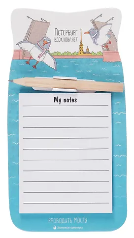 Стильный блок для записей с магнитом и карандашом станет ярким акцентом на холодильнике или магнитной доске. Атмосферный вид Санкт-Петербурга и фраза «Петербург вдохновляет разводить мосты» каждый день настраивают на творческий лад и помогают не забывать о делах.