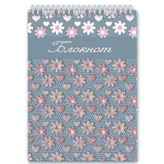 Блокнот,А7, 40л. арт. 47976/5 ЦВЕТОЧНАЯ ФАКТУРА /полноцв. обложка, бумага 250 г, мел., глянцевый УФ-лак выборочный с глиттером. Блок - 40 листов, клетка, офсет 60 г. Гребень по короткой стороне/