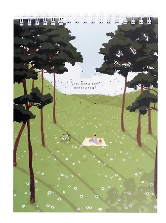 От этого блокнотика как будто веет тёплым летним днем, пикником в лесу, теплым солнышком, играми с друзьями. Очень уютная и теплая обложка, яркая, плотная. Небольшая мотивирующая цитата отлично дополняет рисунок на обложке. Выглядит все вместе очень эстетично и приятно.