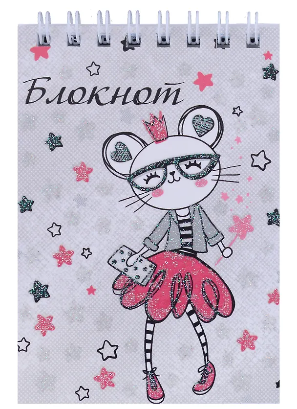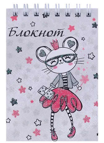 Очень понравился этот блокнот "МЫШКА-МОДНИЦА" приобрела как то в самом магазине. Обложка лёгкий картон так что если его носить просто в кармане можно помять. На поверхности напечатано цветное изображения с на несением частично глиттером, который сидит отлично и не осыпается что очень радует. Листы с дух сторон в клетку, обьем листов обычный, соединены между собой листы пружиной. Блокнот не большого размера.