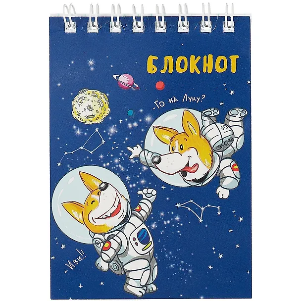 Блокнот формата А7, в мягкой обложке, 40 листов в клетку "ЩЕНКИ-КОСМОНАВТЫ", страницы соединяет сплошной гребень, глянцевая УФ-лакировка. Хороший блокнот маленького размера, с космическим изображением на глянцевой обложке, а именно: с двумя щеночками - космонавтами одетых в скафандры, и находящимися в открытом космосе, даже можно разглядеть созвездия и планеты.