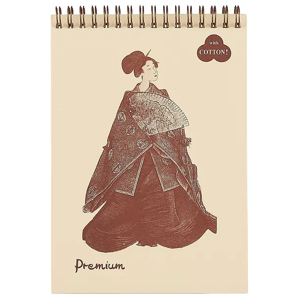 Обычная бумага серии premium, фактура под холст (не такая как у акварельных "холстов", мельче, чаще и рельефнее), цвет насыщенный кремовый, ярче обычной "слоновой кости". Как вся бумага этой серии, с возрастом (лет 5-6) желтеет, не пойми почему, помечена как бескислотная и на солнце не попадает. Эта - наименее критично, чуть теряет теплоту, розоватость. Резинку терпит неохотно, от активного стирания может заворситься, воду, несмотря на плотность - не терпит совсем. Может пережить густую гуашь. Толстые ручки - роллеры и гелевые, без риска стирания - вполне, письму фактура не мешает. Пастель принимает любую, пропорционально фактуре, больше всех бумаг этой же фирмы, и меньше абразивных. Карандаши держит хорошо. Звезд с неба не хватает, но в заявленном диапазоне-работает. Весь блокнот сделан из одной и той же бумаги, пружина тонкая, но прочная, подложки сзади нет, весь блок мнется и гнется.