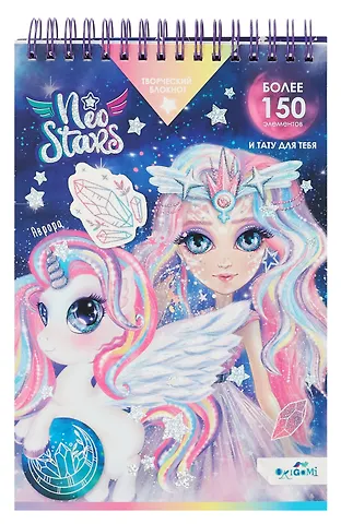 Блокнот "Венера. Neo Stars" очень понравился из-за его наполнения. В нем все для творчества тут вам и наклейки как цветные так и для самостоятельно раскрашивания, переводные золотые тату, рисовать, раскрашивать раскраски, делать записи на цветных и не только листах. У блокнота обложка плотная так что можно делать зарисовки и на весу, и с очень красивым рисунком с добавлением блесток.