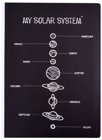 Что вызывает вопросы, так это количество планет Солнечной системы на обложке. По каким-то причинам их изображено не 8, как положено, а 9. В самом низу находится Плутон, хотя его быть не должно: он официально исключён из числа планет ещё в 2006 году. В итоге первое, что приходит в голову: блокнот – это какое-то старьё, лежащее на складе с того самого 2006 года. Смущает такой непрофессиональный подход производителя к делу.
