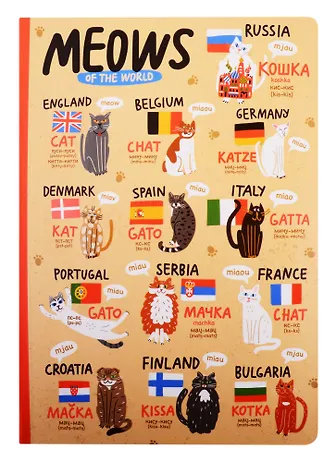 Заказывала этот блокнот сначала в подарок подруге, а потом и себе, так как очень уж понравился. Очень приятный на ощупь, гладкий. Листы плотные, белые, без линовки, удобно и для заметок, и даже в качестве скетчбука. На обложке можно почитать как будет слово «кот» на других языках, а сзади можно посмотреть как мяукание будет на других языках - очень неожиданно и прикольно