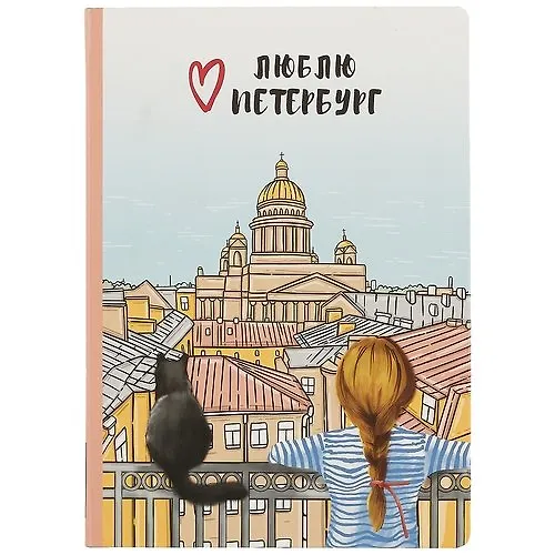 Мы видим город Санкт-Петербург, а также девочку с котом. Девочка стоит справа облокатившись на перила. Она одета в голубую кофточку с белыми полосками. У неё золотистые волосы, которые заплетены в косу. На конце косы розовая ниточка. Слева от неё сидит на перилах чёрно-серый кот. Они оба смотрят с высока на прекрасный город—Санкт-Петербург. Сверху есть надпись люблю Петербург. Очень хороший блокнот, всем советую!