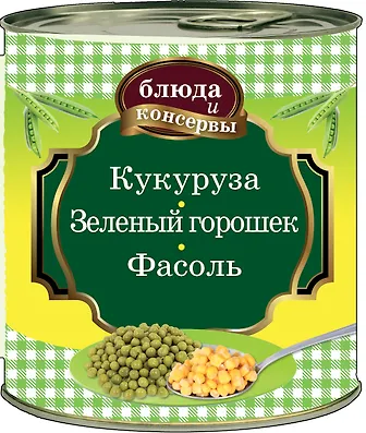 Блюда и консервы. Кукуруза. Зеленый горошек. Фасоль.