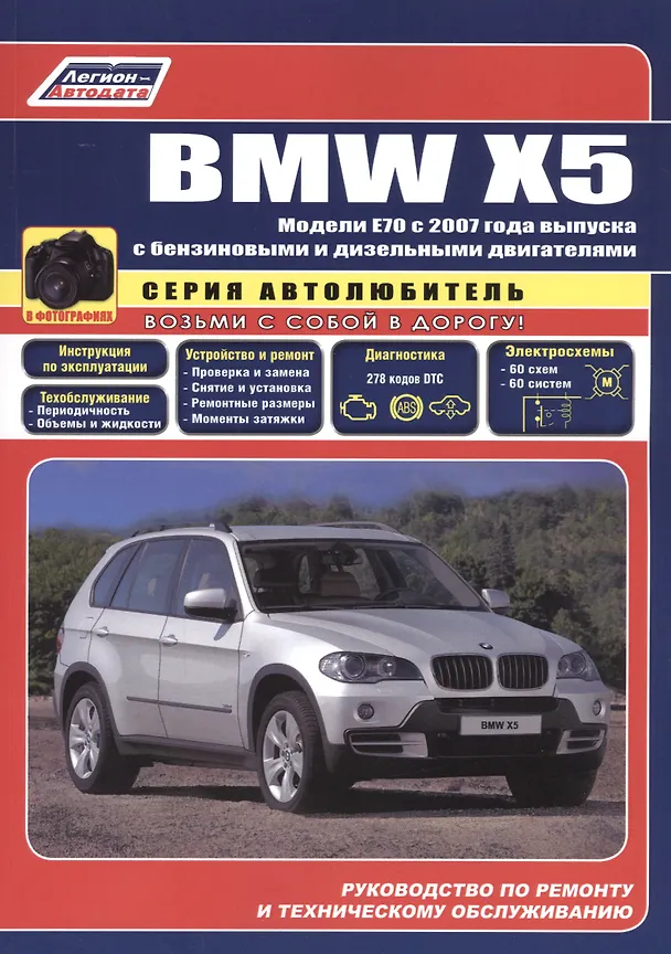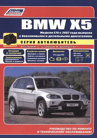 .Издание содержит руководство по эксплуатации, подробные сведения по техническому обслуживанию автомобиля, проверке и элементов системы управления бензиновыми и дизельным двигателями (в т.ч. D-VANOS и Valvetronic), системы турбонаддува, автоматических коробок передач, раздаточной коробки (система управления полным приводом "xDrive"), элементов тормозной системы, системы рулевого управления и подвески. Приведены проверки элементов системы динамического контроля устойчиво