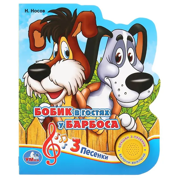 .На каждой страничке рассказ Николая Носова «Бобик в гостях у Барбоса» с красочными иллюстрациями из одноимённого советского мультфильма. Малыш будет с удовольствием рассматривать яркие страницы с изображением любимых персонажей, читать историю, слушать песни, подпевать и даже танцевать. Ребёнок легко освоит включение звука: по нажатию на кнопку звук включится, при втором нажатии выключится. Композиции исполняются профессиональными артистами. Книжка сделана из плотного картона, поэтому родители могут не опасать