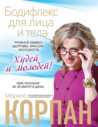 Бодифлекс для лица и тела Тройной эффект здоровье, красота, молодость. От Марины Корпан. Отличный подарок любой девушке после 25 лет. Комплекс упражнений описан очень подробно, выполнять их нетрудно - простое дыхание по методике, комплексы для стройной фигуры и кислородную гимнастику для лица, и что еще понравилось- рецепты полезных блюд в красивых иллюстрациях, что даже хочется их попробовать.