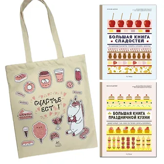 Замечательный комплект! Шикарный подарок на праздник. Брала своей подружке, ей очень понравилось. В книгах куча интересных вкусных рецептов. Объяснено очень подробно, каждый шаг прописан, ещё схемы представлены. Много ярких картинок. Ну и вишенка на торте - шоппер. Безумно милый, классный, модный, яркий. Выглядит очень по девичьи. Хорошее качество выполнения. Надёжный приятный материал изготовления. Вопщем всё очень достойно, всем советую к приобретению!