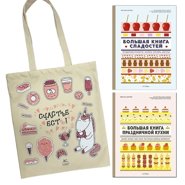 Чудесный подарочный комплект с сумкой-шопером. Книги станут хорошими помощниками в организации праздничного стола.. В первой ("Большая книга праздничной кухни"), предлагаются оригинальные решения закусок в виде разнообразных канапе, рулетов, тарталеток, нестандартных супов и десертов. Автор представляет интересные идеи подбора продуктов для порционных закусок, знакомит с приемами кулинарной обработки продуктов, пошагово учит готовить основные блюда, соусы и приправы, делать выпечку. Вторая же книга ("Большая книга сладостей") посвящена изготовлению лакомств в виде конфет, карамели, леденцов, мармелада, орешек в сахаре и прочих вкусностей. Автор знакомит с разновидностями глазури и начинок, свойствами желирующих веществ и ароматических добавок, как украшать и хранить конфеты