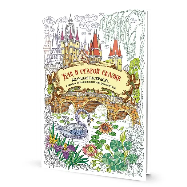 Большая раскраска с мелкими деталями и цветными фрагментами: Как в старой сказке