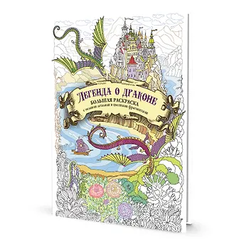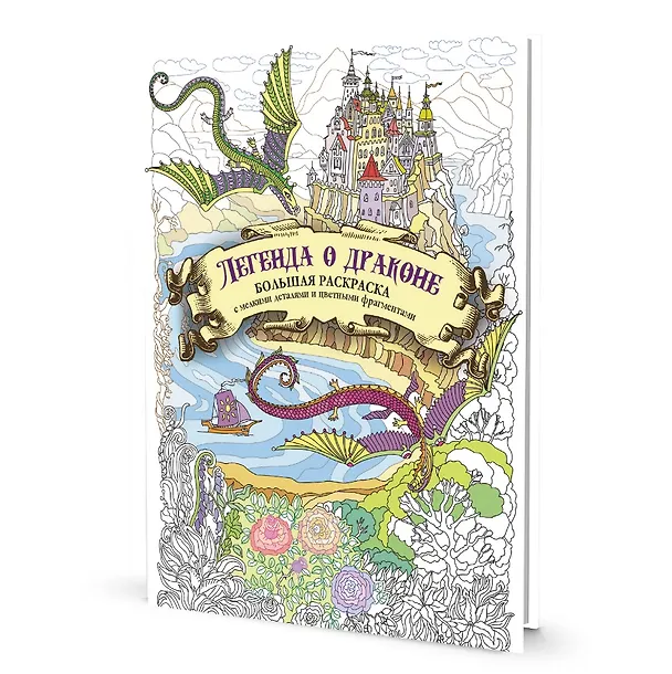 Большая раскраска с мелкими деталями и цветными фрагментами: Легенда о драконе