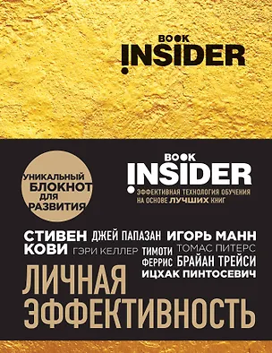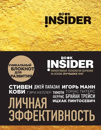 Блокноты для развития Book Insider - революция в самообразовании. В блокноте "Личная эффективность" есть список из семи лучших, проверенных временем бестселлеров по личной эффективности, которые нужно изучить; уникальная авторская методика сверхобучения "Три П" Ицхака Пинтосевича; страницы для заполнения по этой методике и страницы для творчества; тесты на проверку знаний; лайфхаки по теме от эксперта. Изучай книги, заполняй блокнот, и ты получишь диплом эксперта по теме "личная эффективность" от Isaac Pintosevich Systems и школы бизнеса "Синергия", а также сертификат на 5000 рублей для прохождения любой программы в школе бизнеса "Синергия". Подробности – внутри блокнота.