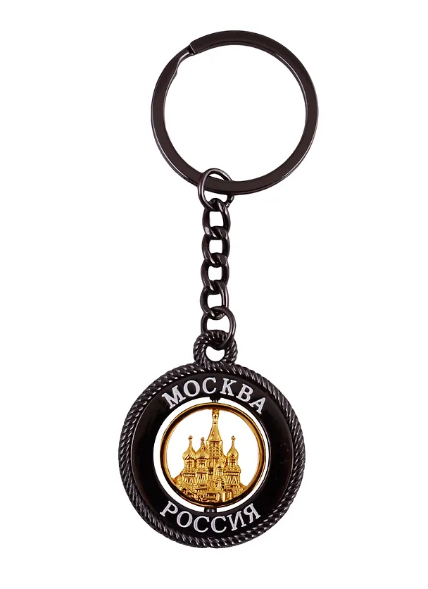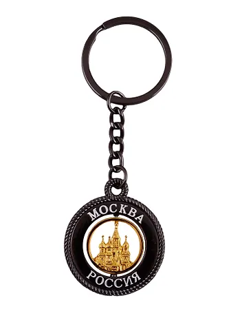 Чёрный брелок с золотым изображением храма Василия Блаженного и Спасской башни будет отличным сувениром из российской столицы.