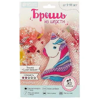 Если в валянии вы новичок, то вам подойдёт этот набор для изготовления брошки из шерсти. В нём есть экошерсть разных цветов, иголка для валяния, основа для броши и подробная пошаговая инструкция. Попробуйте, мы уверены, у вас получится отличный маленький единорог!