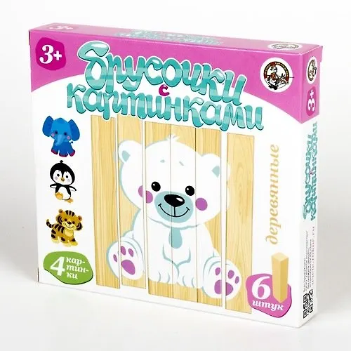 Правильно складывая деревянные брусочки, ребенок сможет собрать 4 тематические картинки – слоненка, пингвинчика, тигренка и медвежонка. Это увлекательное занятие, развивает память и образное мышление.