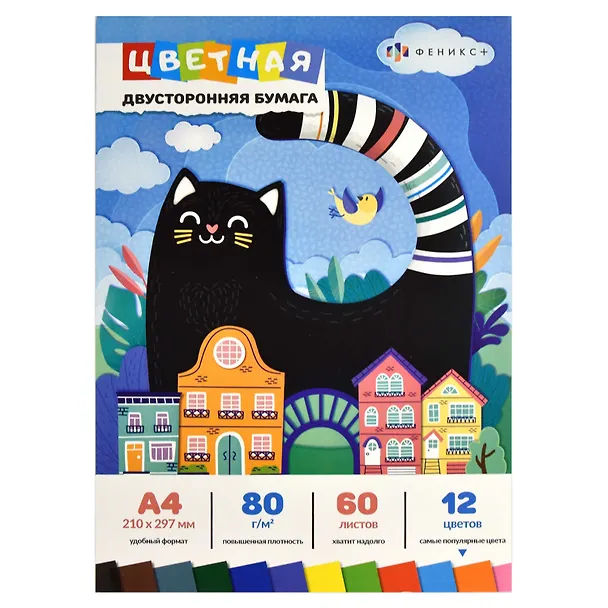 Цветная бумага. Размер: 210х297 мм. Формат А4. Количество листов - 60. Количество цветов: 12 (голубой, жёлтый, зелёный, коричневый, красный, оранжевый, розовый, серый, синий, тёмно-зелёный, фиолетовый, чёрный). Тип обложки: мягкий переплёт. Способ скрепления блока: КБС. Материал обложки: мелованная бумага 250 г/м². Печать обложки: полноцветная печать. Страна: Китай. Плотность: 80 г/м².