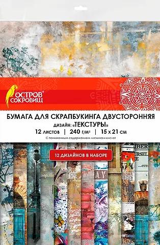 Дизайнерская бумага с пониженным содержанием лигнина и кислот, плотностью 240 г/м2, созданная специально для использования в скрапбукинге. Двусторонняя матовая бумага отличается высоким качеством печати. Основное отличие бумаги для скрапбукинга остров сокровищ от обычной – минимальное содержание в составе лигнина и кислоты. Соответственно, первозданный вид изделия сохранится надолго, гораздо дольше, чем при использовании обычного материала. Дизайнерская бумага используется везде, где применяется техника скрапбукинг. Это не только оформление фотоальбомов или открыток. Бумагой для скрапбукинга можно смело декорировать коробочки, подарочную упаковку, картонные шкатулки, чайные домики, настенные