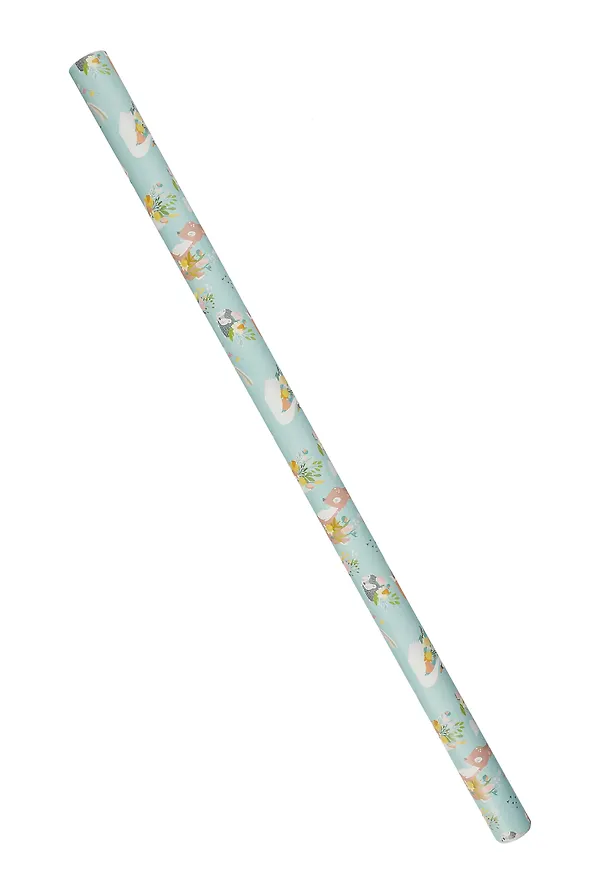 Бумага в нежных тонах, но при этом сквозь нее не просвечивают темные предметы. Цвет фона бледно-голубой, я бы даже сказала с немного ментолового оттенка. Принт состоит из белого медведь с букетом и венком, ежика с цветами и фруктами, олененка с весенними цветами, лисички с тюльпанами и пионами, скромного лебедя, нежных голубей и других более миниатюрных украшений - флажки, звездочки, облачка и так далее.