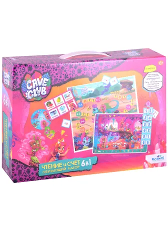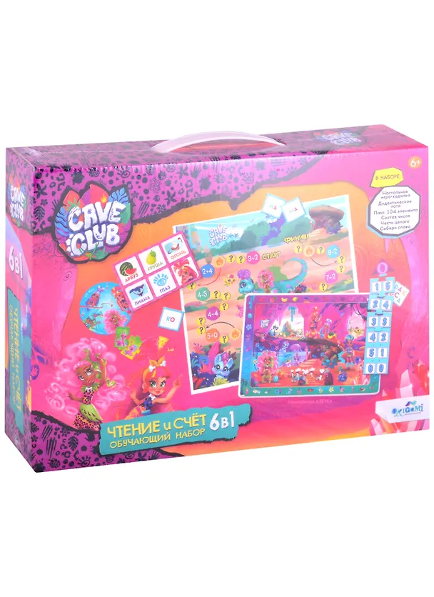 Обучающий набор 6в1 создан для эффективных занятий с ребенком. Внутри красивой подарочной коробки, выполненной в дизайне Cave Club, вы найдете все для развития навыка чтения и счета. Все задания в игровой форме и включают в себя дидактическое лото, изучение состава числа и