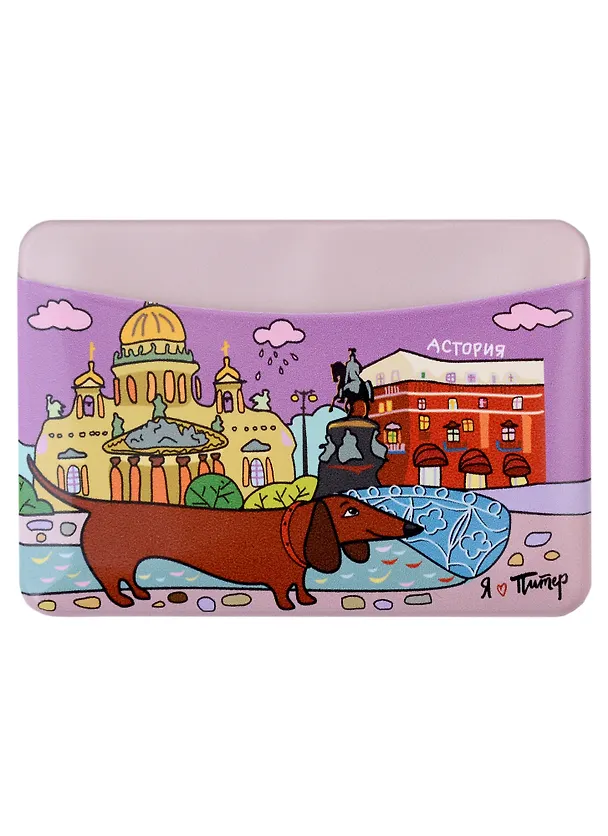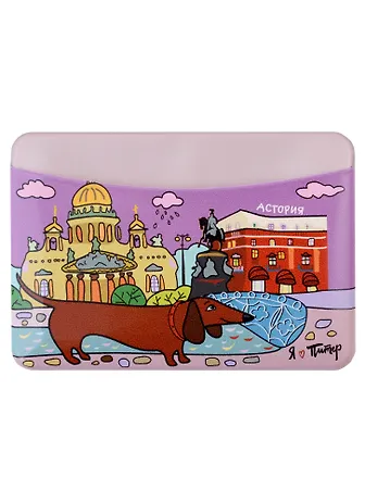 На чехле для карточек изображён красочный Исаакиевский собор, гостиница «Астория» и приветливая такса. В чехол можно положить две карточки – по одной с каждой стороны.