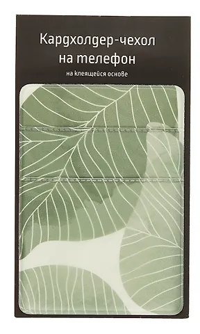 Картхолдер выполнен из ПВХ с красивым рисунком листьев. На передней стороне расположены два кармашка для социальных и банковских карт, проездных и пропусков. На задней — клеящаяся основа, чтобы прикрепить картхолдер к смартфону.
