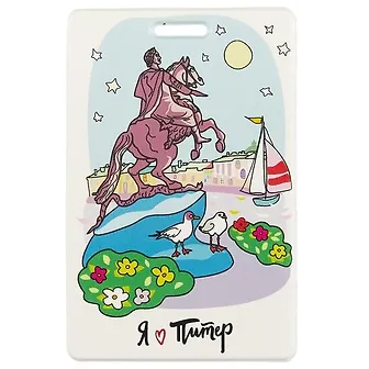 Чехол для карточек «Медный всадник» сделан из мягкого пластика. С одной стороны на нём нарисован знаменитый памятник Петру I, а с другой сделан прозрачный кармашек.