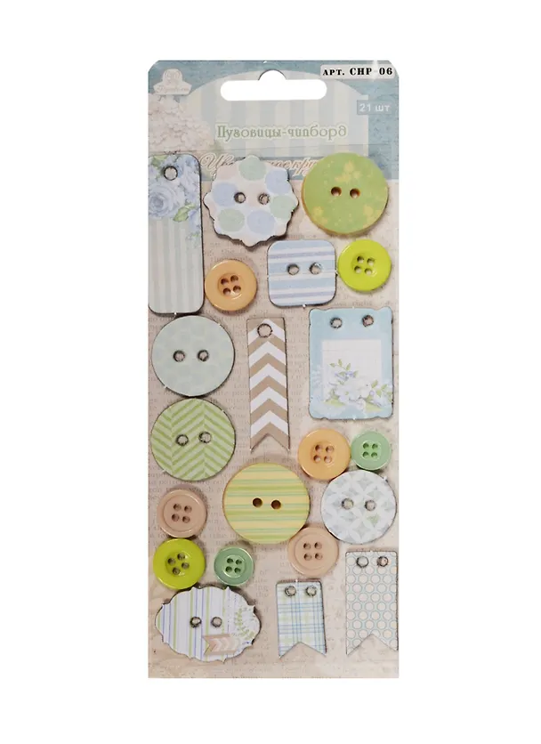 Чипборд-пуговицы изготовлены из плотного картона. Элементы выполнены в виде пуговиц разных размеров и дизайнов. В наборе - 21 штука.