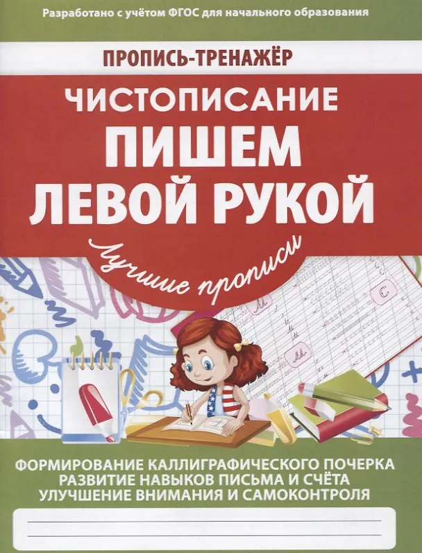 Вашему вниманию предлагается пропись-тренажер "Чистописание.Пишем левой рукой". Пропись поможет сформировать каллиграфический почерк, развивать навыки письма, способствует улучшению самоконтроля. Разработана сучетом ФГОС для начального образования.