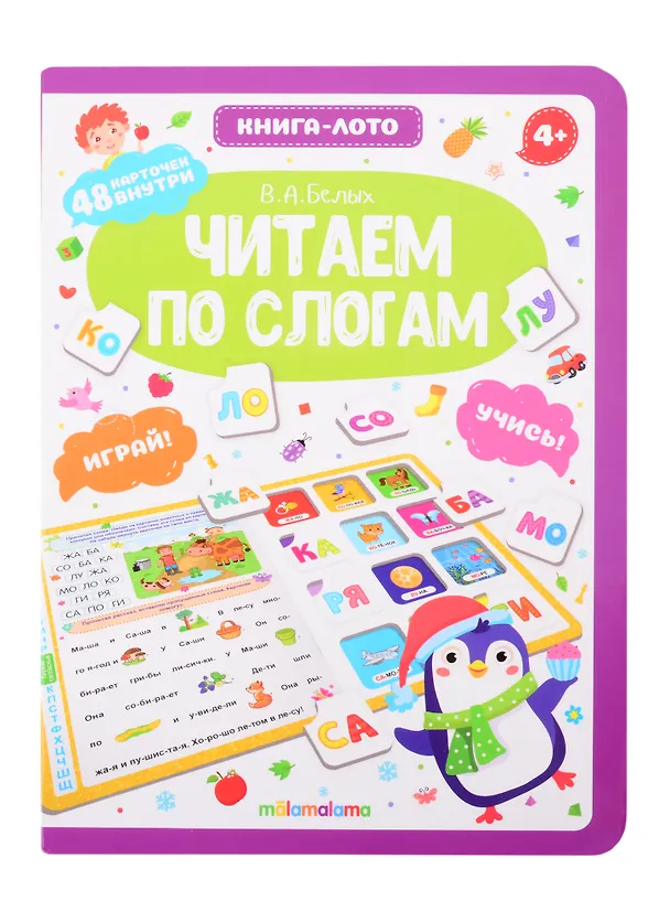 «Читаем по слогам» — это книга-лото. Содержит 48 карточек, которые помогут выполнить множество увлекательных и развивающих заданий, созданных по методике педагога-психолога В. Белых. Книга сделана из переплётного картона, покрыта ВД-лаком, обложка из плотного картона с глянцевой ламинацией. Количество страниц — 8. Размер книги — 220*160 мм.