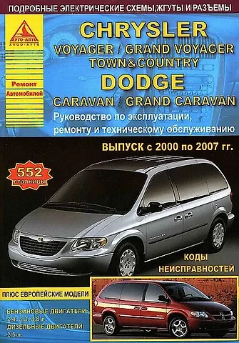 Руководство по эксплуатации, ремонту и техническому обслуживанию автомобилей Chrysler Voyager/ Grand Voyager Town & Country, а также Dodge Caravan / Grand Caravan 2000-2007 годов выпуска с бензиновыми (2,4; 3,3; 3,8 л.) и дизельными (2,5 л.) двигателями. Руководство снабжено подробными электрическими схемами.