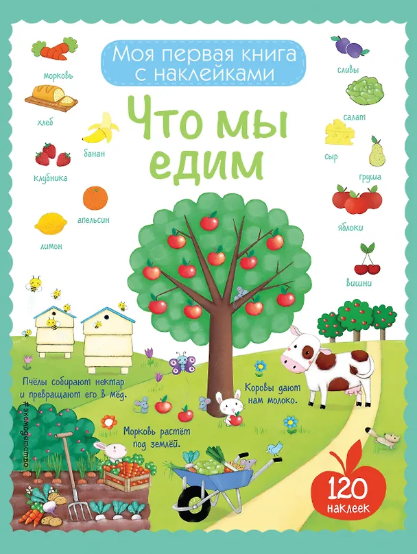 Книга «Что мы едим» – это замечательная возможность для детей не только познакомиться с окружающим миром и узнать, что такое паста, как делают хлеб, откуда берётся молоко, у каких овощей едят «вершки», а у каких «корешки», но и весело провести время, приклеивая наклейки (а их в книге более 100!). Эти наклейки специально предназначены для маленьких ручек - они не имеют острых углов. Дети не будут испытывать трудности с их приклеиванием.