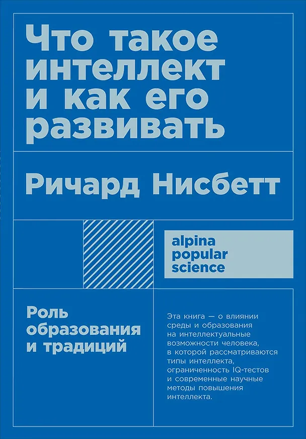 Умнее ли мы, чем наши бабушки и дедушки, и если да, то в чем именно? Можно ли сравнивать умственные способности у африканских аборигенов и у представителей западной цивилизации? В чем несовершенство существующих систем оценки интеллекта и делает ли нас умнее школа? На эти и множество других вопросов отвечает Ричард Нисбетт, один из самых выдающихся современных социальных психологов. Анализируя материалы исследований, статистику приемных семей, результаты школьных экспериментов, Нисбетт опровергает концепции генетической предопределенности интеллекта и показывает роль и возможности культурной среды и образования.