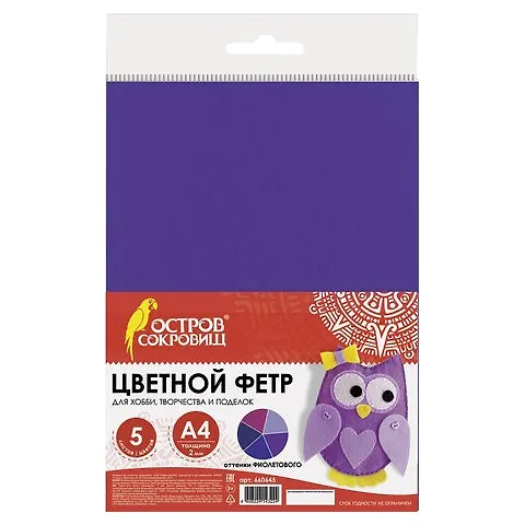 Цветной фетр ОСТРОВ СОКРОВИЩ предназначен для создания ярких творческих поделок дома, в школе и в детском саду. Используется для создания аппликаций и вышивания, легко режется и приклеивается на ровную поверхность.