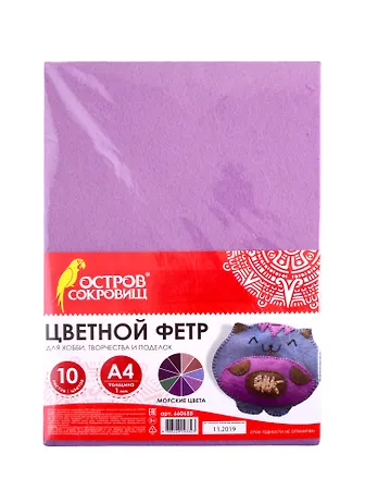 Цветной фетр ОСТРОВ СОКРОВИЩ предназначен для создания ярких творческих поделок дома, в школе и в детском саду. Используется для создания аппликаций и вышивания, легко режется и приклеивается на ровную поверхность.