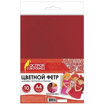 Цветной фетр ОСТРОВ СОКРОВИЩ предназначен для создания ярких творческих поделок дома, в школе и в детском саду. Используется для создания аппликаций и вышивания, легко режется и приклеивается на ровную поверхность.