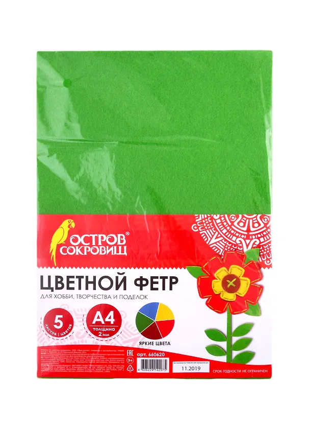 Цветной фетр ОСТРОВ СОКРОВИЩ предназначен для создания ярких творческих поделок дома, в школе и в детском саду. Используется для создания аппликаций и вышивания, легко режется и приклеивается на ровную поверхность.