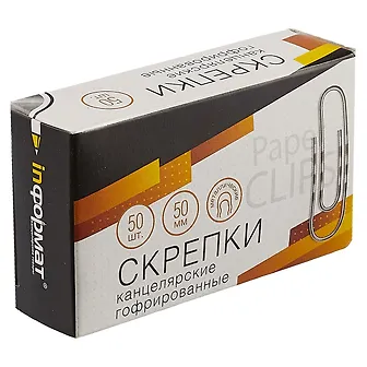 Скрепки канцелярские металлические. Скрепки гофрированные имеют волнистую поверхность для надежного скрепления больших пачек документов. Упакованы в картонную коробку. В упаковке 50 штук. Длина скрепки - 50 мм. Стандартной овальной формы.