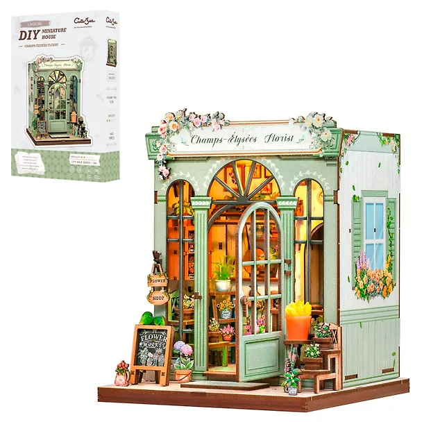 CWGC201 Конструктор интерьерный – сборный домик CuteBee - Магазин цветов "Елисейские Поля", 199 деталей (материалы: дерево, картон, пластик, металл), со световыми эффектами (подсветка интерьера), с питанием от 2хААА батареек (не включены), серия DIY, воз
