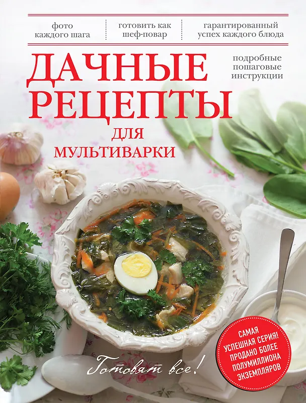 Дачные рецепты для мультиварки Подробные пошаговые инструкции для тех, кто недавно купил мультю и только начал к ней примеряться. Даже есть фотографии каждого шага. Единственное вот- на на даче чаще всего ешь грибы, ягоды- я думала тут будет упор на них- а здесь и цветная капуста, и томаты- упор на то, что растет на грядках. И много вариантов консервирования- для меня эта тема оказалась полезной, в моей книге практически ничего не было по этой теме. Ну и цена нормальная, и рецепты вкусные, правда их не много, зато они простые и необычные.