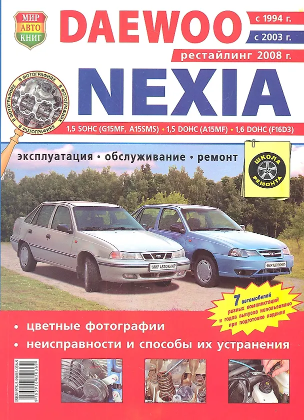 В книге изложено описание работ по техническому обслуживанию и ремонту автомобилей Daewoo Nexia выпуска с 1994 года и рестайлинговой модификации выпуска с 2008 года на базе готовых запасных частей в условиях гаражной мастерской. Все рабочие операции сопровождаются фотографиями и подробными комментариями, что позволит сэкономить время, силы и средства, а также свести к минимуму риск повреждения техники. Пособие предназначено для автомехаников, а для также автомобилистов, занимающихся самостоятельным обслуживанием и ремонтом автомобилей. Художник Елена Плужнова.