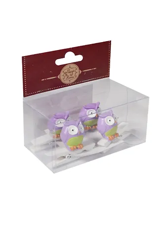 Декор. прищепка Фиолетово-зеленые совушки (39437) (набор 4шт) (из древесины березы с декором из полирезины) (упаковка)