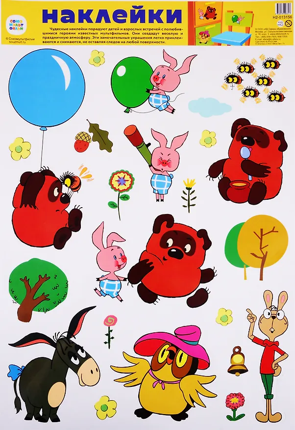 Огромные, прекрасные наклейки.Много героев из любимой сказки ребенка Винни-Пух. Персонажи нарисованы из советского мультика Винни-Пух, а не английская версия. Любимые союзмультфильмовские герои: Винни-Пух, Сова, Пятачок, Ослик Иа,Кролик и пчелы