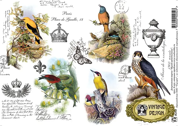 Декупажная карта "Музей орнитологии" на тонкой бумаге, не требует предварительного выдерживания в воде для творчества.