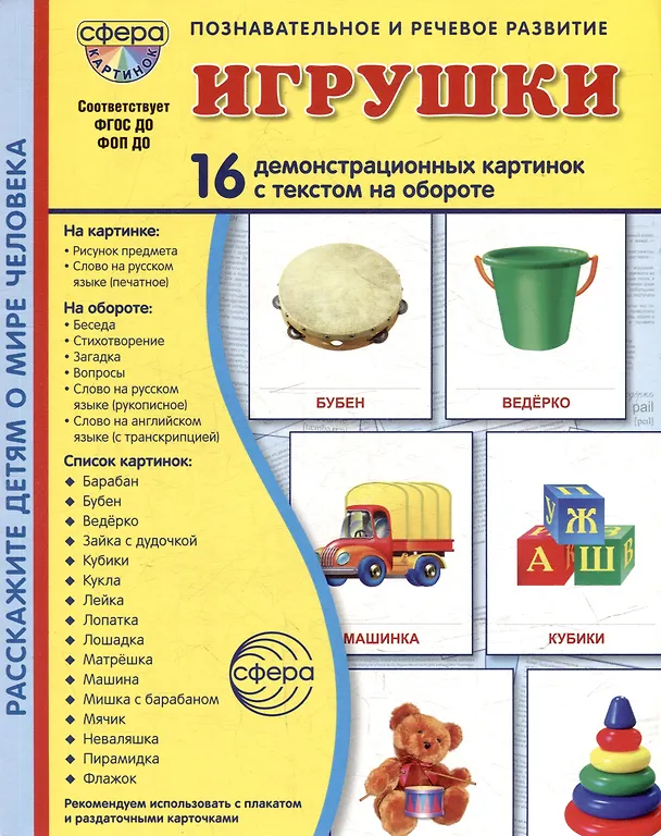 Демонстрационные картинки "Игрушки". 16 демонстрационных картинок с текстом на обороте