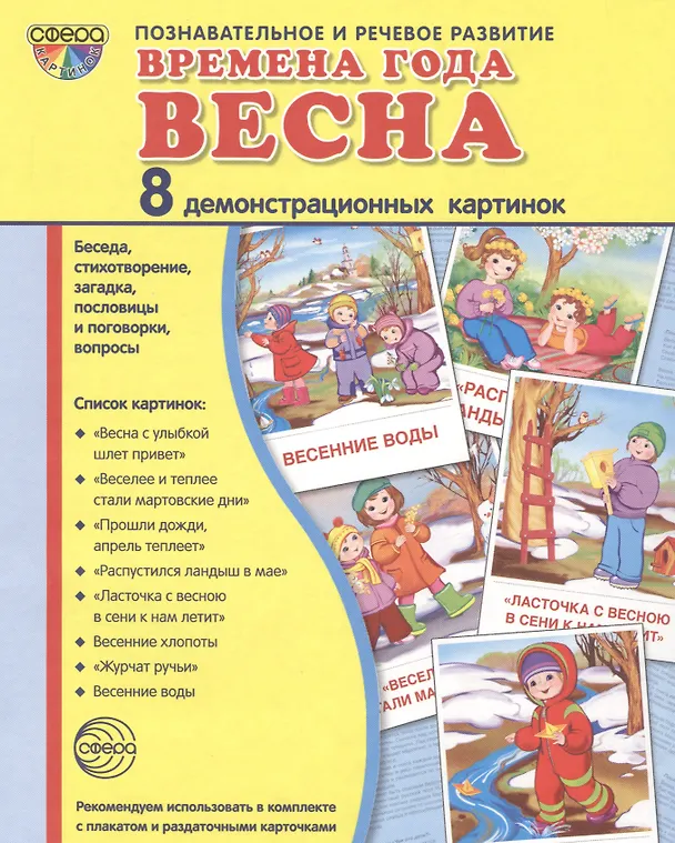 Картинки яркие, красочные, позитивные, привлекают внимание детей. Каждая картинка озаглавлена и соответствует весенней примете. На обороте размещена полезная информация о времени года, народные приметы весны, загадки, пословицы, стихи, дидактические игры.